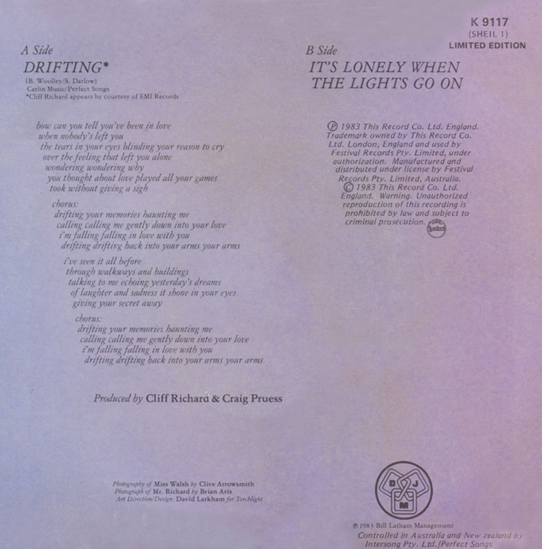 Sheila Walsh / Cliff Richard DJM K 9117 (1983) º Charted at #21 Drifting (Sheila Walsh and Cliff Richard) // It's Lonely When The Lights Go On (Sheila Walsh) (DJM records were released in generic FESTIVAL sleeves) |
