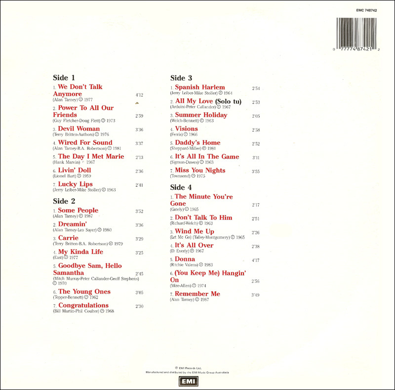 Remember Me (Record 2 of a 2 LP Set) (Back Cover shown) EMI EMC 748742 (Double LP) (198x) Spanish Harlem / All My Love (Solo Tu) / Summer Holiday / Visions / Daddy's Home / It's All In The Game / Miss You Nights // The Minute You're Gone / Don't Talk To im / Wind Me Up / It's All Over / Donna / (You Keep Me) Hangin' On / Remember Me |