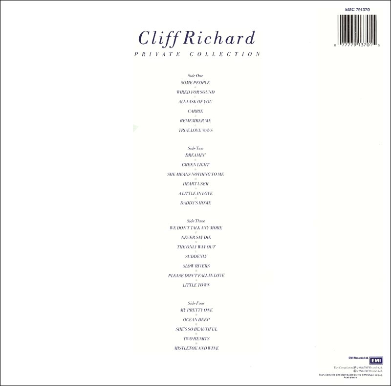 Private Collection 1979-1988 (Record 2 of a 2 LP Set) (Back Cover shown) EMI EMC 791370 (Double LP) (1988) We Don't Talk Anymore / Never Say Die / The Only Way Out / Suddenly / Slow Rivers / Please Don't Fall In Love / Little Town // My Pretty One / Ocean Deep / She's So Beautiful / Two Hearts / Mistletoe And Wine |