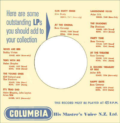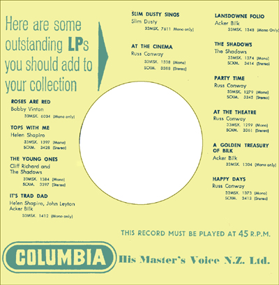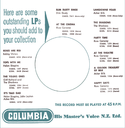 Live At The Paris Olympia EMI EMC 3095 (November 1975) The Rise And Fall Of Flingel Bunt / Man Of Mystery / Lady Of The Morning / Nivram / Tiny Robin / Honourable Puff Puff / Sleepwalk / Apache // Shadoogie / Guitar Tango / Marmaduke / Somewhere / Little "B" / Rock Medley: Lucille>Rip It Up>Blue Suede Shoes * There is always serious conjecture as to whether EMI EMC 3095 was ever commercially released in New Zealand |