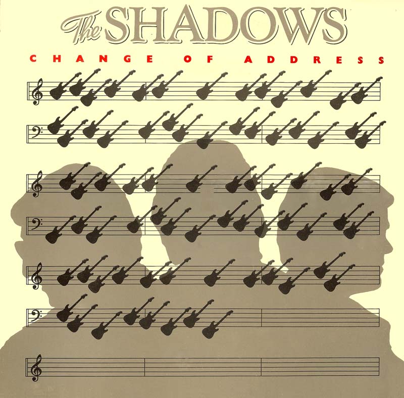 Change of Address EMI EMC 171 (1980) Mozarte Forte / Midnight Creepin' / Change of Address / Just The Way You Are / Indigo / Arty's Party // Outdigo / Hello Mr. W.A.M. / Temptation / Albatross / If You Leave Me Now / Equinoxe (Part V) * This was the first record issued by The Shadows under the "Roll Over Records" banner |