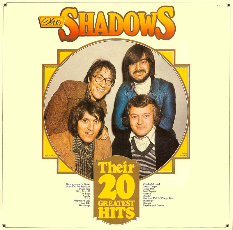 The Shadows Greatest Hits Columbia SCXM.1522 (Stereo) (May 1974) Apache / Man Of Mystery / The Stranger / F.B.I. / Midnight / The Frightened City / Kon-Tiki // 36-24-36 / The Savage / Peace Pipe / Wonderful Land / Stars Fell On Stockton / Guitar Tango / The Boys / Dance On |