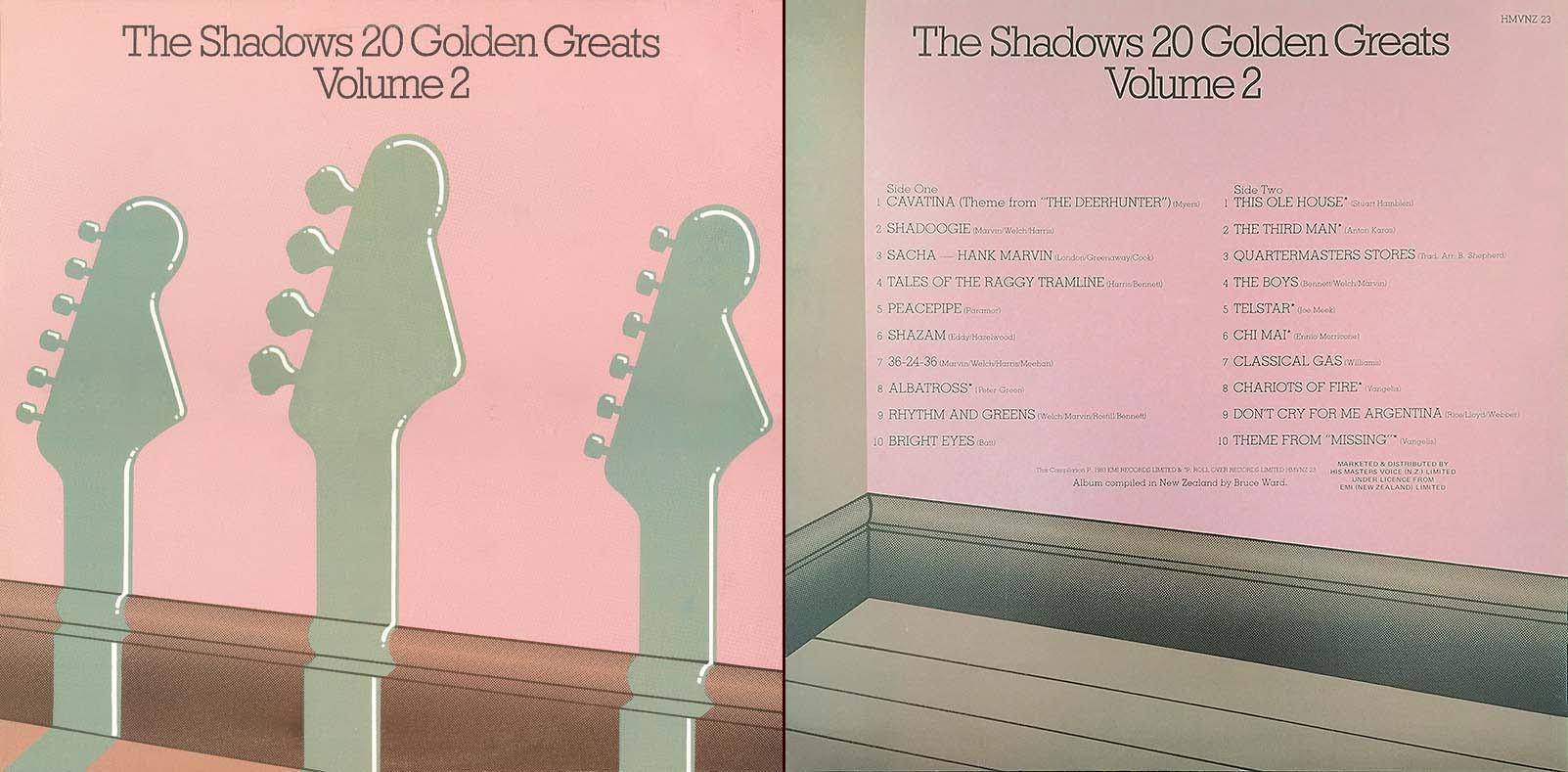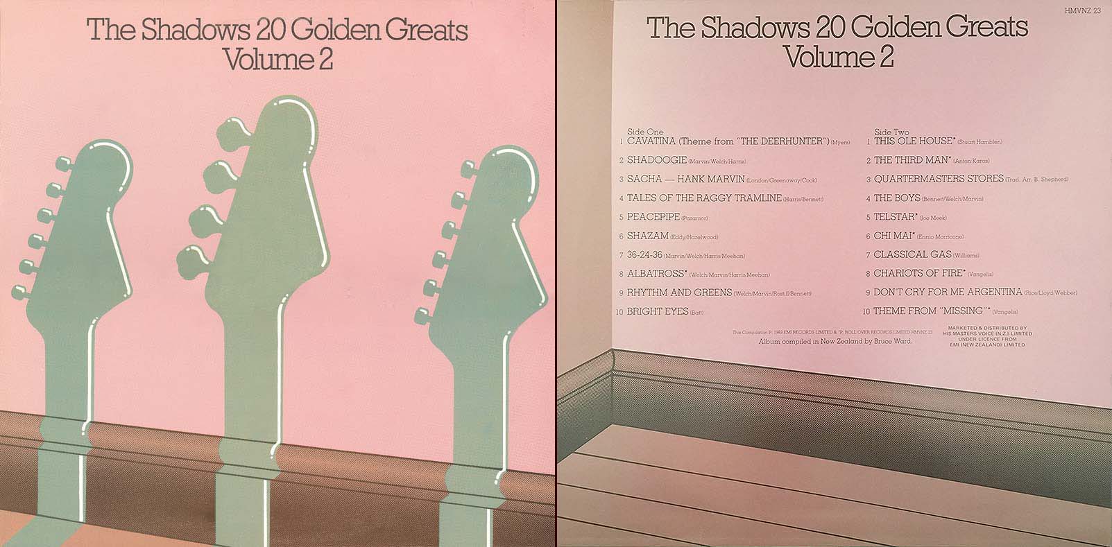 The Shadows 20 Golden Greats Volume 2 EMI HMVNZ 23 (1983) Cavatina / Shadoogie / Sacha / Tales Of A Raggy Tramline / Peacepipe / Shazam / 36-24-36 / Albatross / Rhythm And Greens / Bright Eyes // This Ole House / The Third Man / Quartermasters Stores / The Boys / Telstar / Chi Mai / Classical Gas / Chariots Of Fire / Don't Cry For Me Argentina / Theme From 'Missing' * Errant Pressing: Track 2 on Side 1 actually contained "Nivram" and not "Shadoogie" as represented by the label * Composer credit for "Albatross" is incorrectly shown as (Welch/Marvin/Harris/Meehan) instead of (Peter Green). The record sleeve also reflects this error |