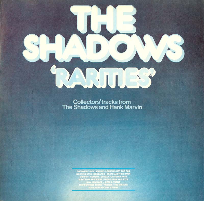 Rock On With The Shadows AXIS AXIS 16 (1980) Apache / Kinda Cool / Shazam / Quartermasters Stores / The Savage / 36-24-36 / Sleepwalk / Man Of Mystery // FBI / Nivram / Shadoogie / Stand Up And Say That / The Rumble / Bo Diddley / Midnight / Frightened City ** Jerry Lordan is noted on Track 1 composer's credit as "Lorden" |
